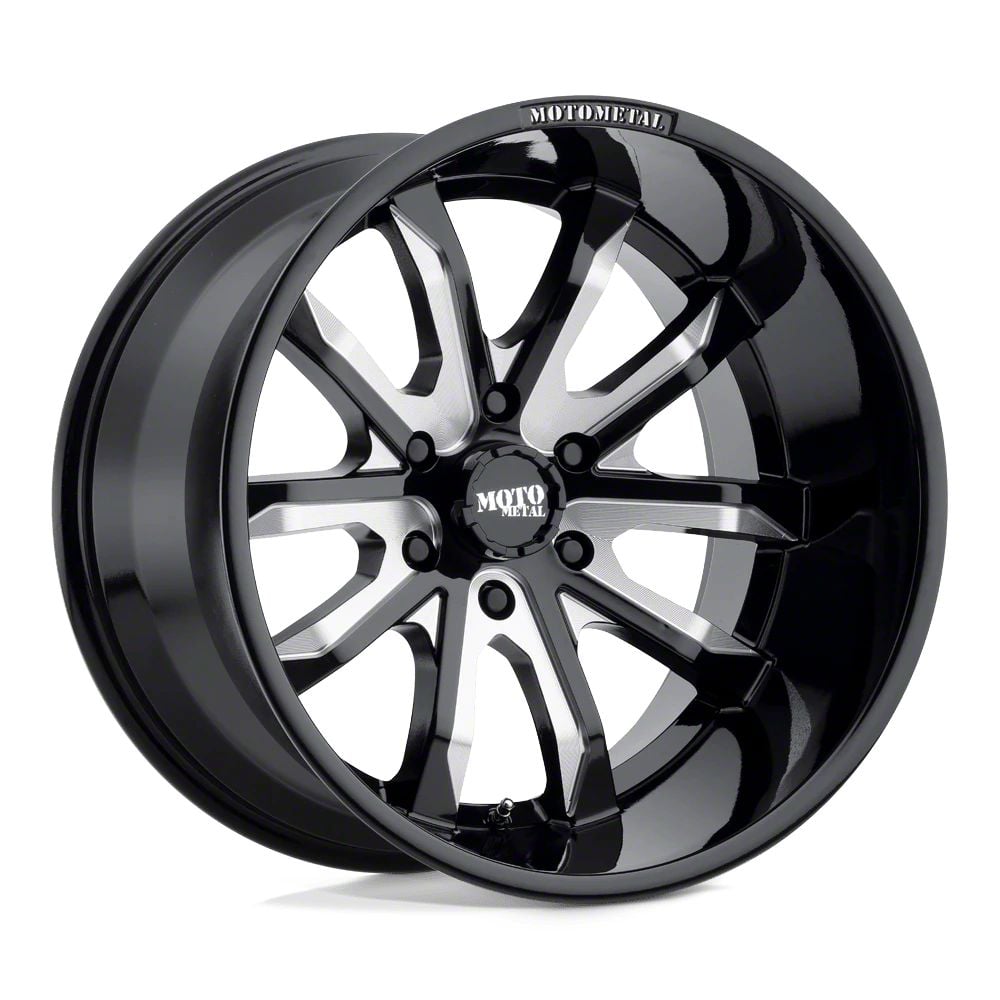 The 20x9 Moto Metal Dagger Gloss Black Milled Wheel is completed in a high-quality gloss black finish with steel milled accents for an aggressive appearance that will turn heads. This wheel features a durable clear coat that stands up to the hazards of everyday driving.