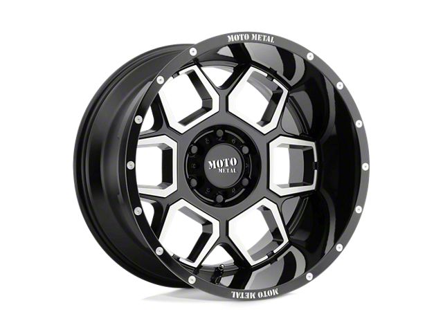 The 20x12 Moto Metal Spade Gloss Black Machined Wheel is completed in a high-quality gloss black finish with machined accents for an aggressive appearance that will turn heads. There is a durable clear coat that withstands the rigors of daily driving.
