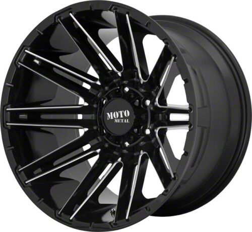 The 20x12 Moto Metal Kraken Gloss Black Milled 6-Lug Wheel; 20x12; -44mm Offset is completed in a high quality, gloss black finish. The milled steel accents are where it really shines through. The accents make the split section of the spokes pop along the faux beadlock.
