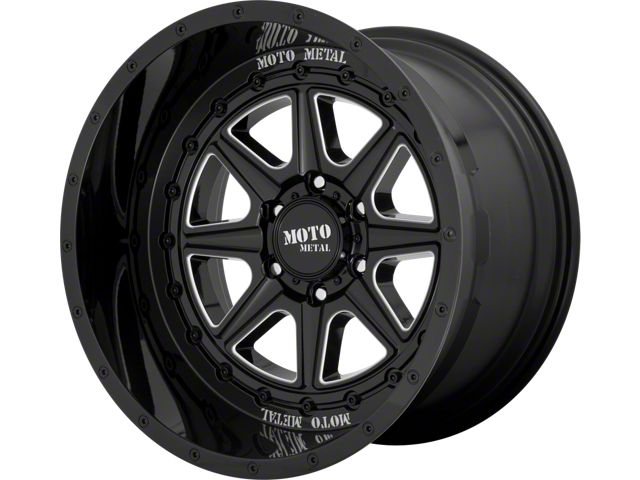This 20x10 Moto Metal MO801 Phantom Gloss Black Milled 6-Lug Wheel is completed in a high-quality gloss black finish with steel milled accents that will create a striking appearance. There's a durable clear coat that protects against driving hazards.