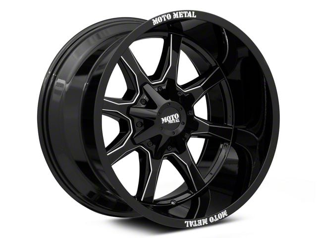 Moto Metal MO970 Gloss Black with Milled Spoke 6-Lug Wheel; 20x10; -18mm Offset offers a striking balance between style and durability. The design speaks to the brand's commitment to quality, enhancing the vehicle's appearance with its distinct look. This wheel, with its unique aesthetics, is ideal for drivers who appreciate a blend of modern design and robust functionality.