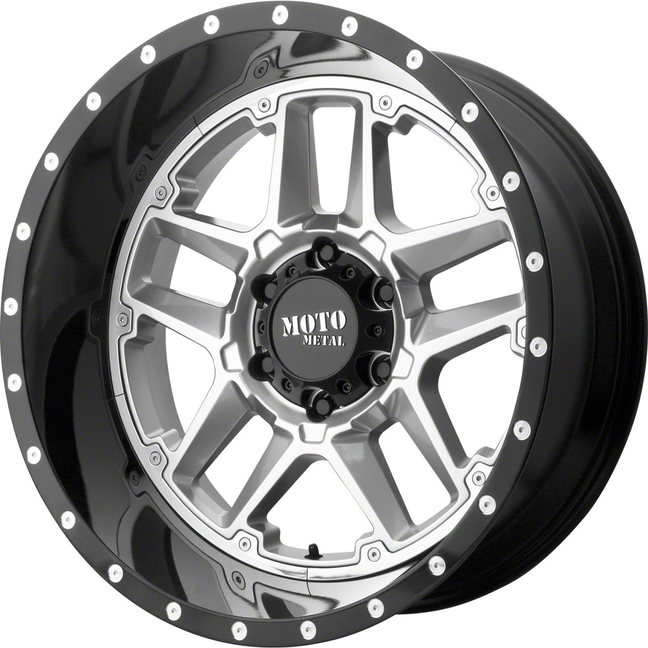 This 20x9 Moto Metal MO987 Sentry Gloss Silver with Gloss Black Lip 5-Lug Wheel is completed in a high-quality finish that will make your wheel the envy of everyone. There's a durable clear coat to ward off driving hazards.