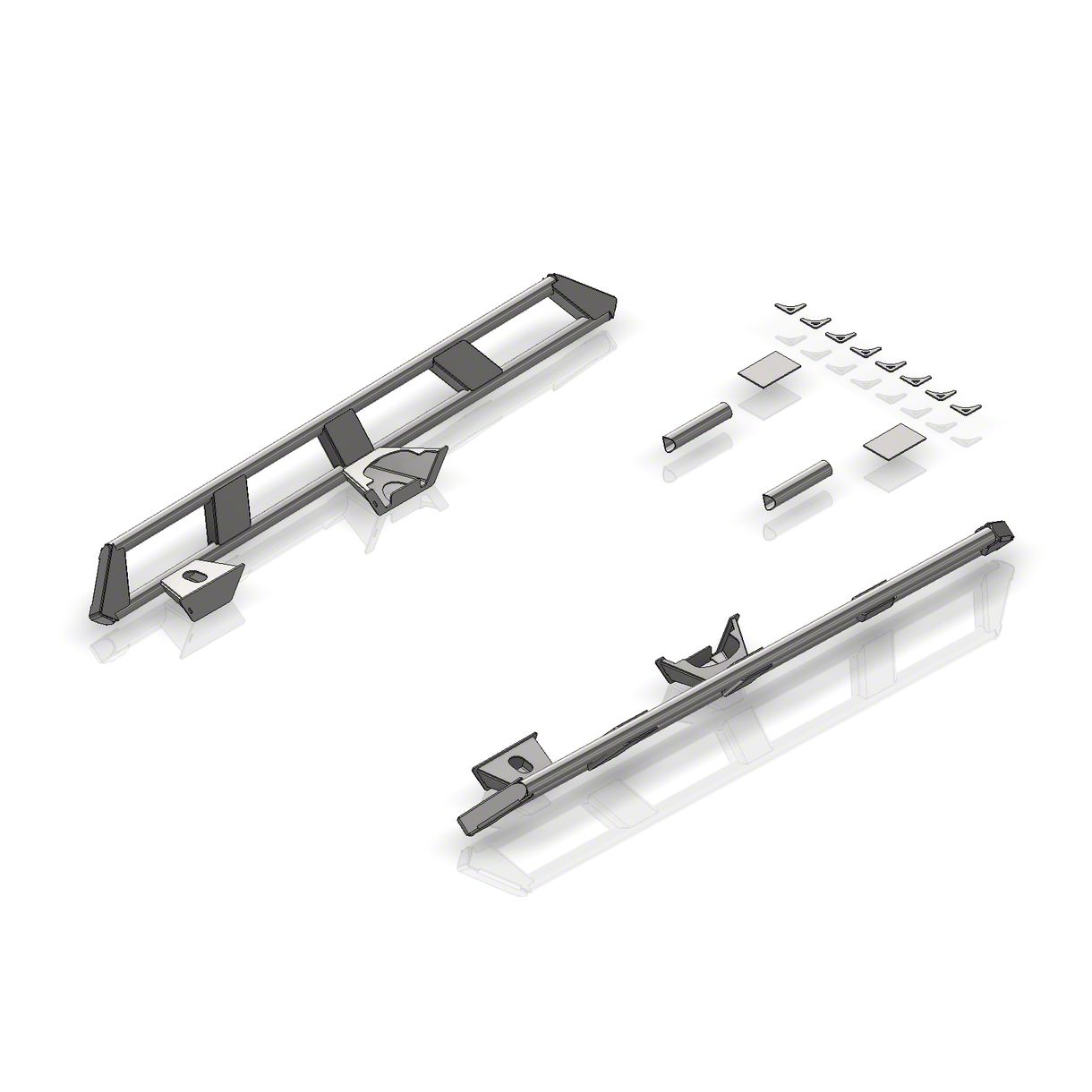 Our kit includes a pair of expertly crafted & fully welded rocker guards with the rear most frame mounting connections removed. We supply loose tubes, plates & gussets so you can fit, weld & install your rear frame mounting connections around many aftermarket long arm suspension brackets with relative ease. The tube slider portion of the Gladiator frame mounted rocker guards is 2” DOM steel tubing.  The end caps and and center bracing are fabricated like the frame mounts from heavy duty 3/16” thick laser cut and formed steel plate