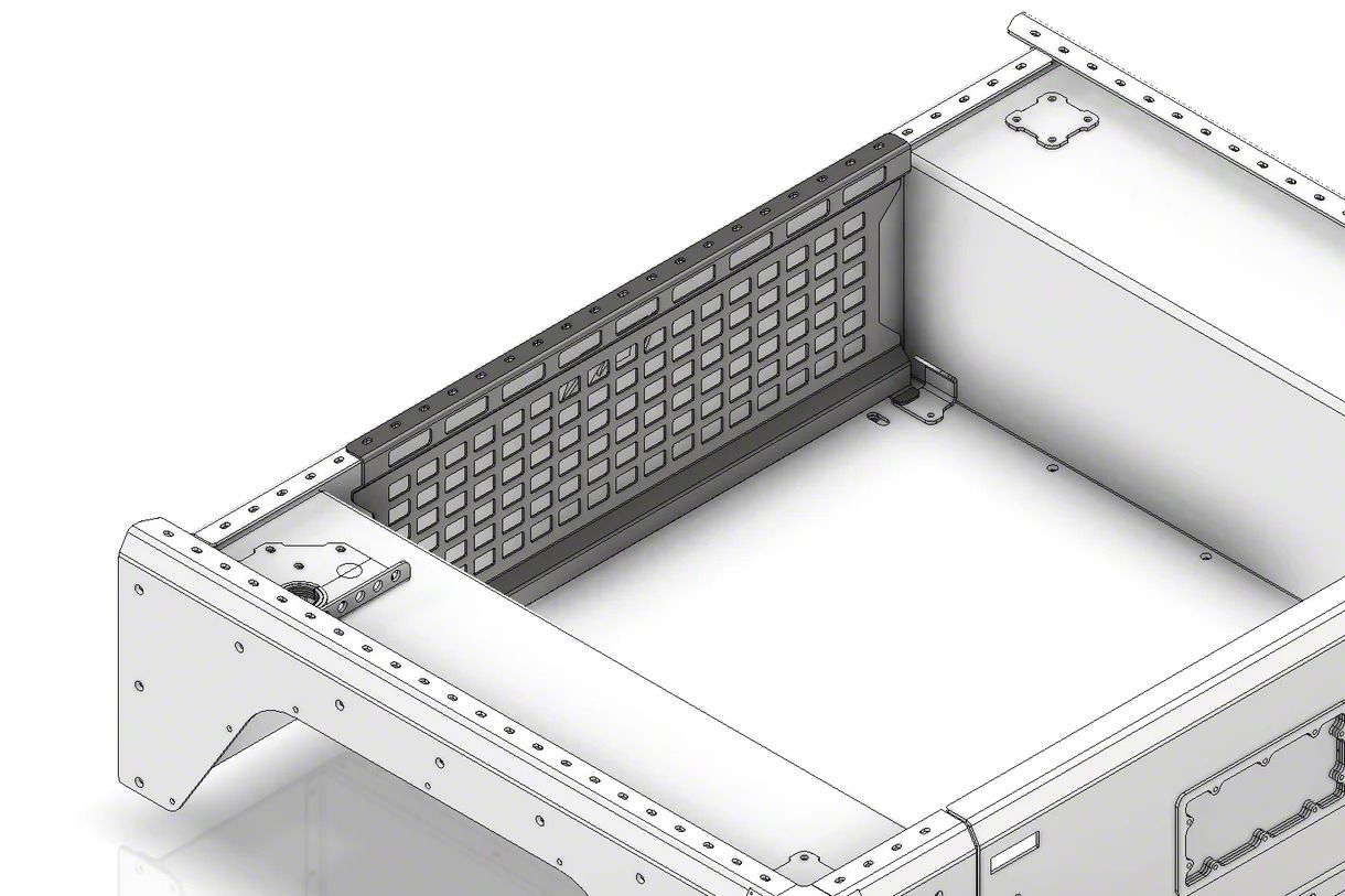 The Motobilt MB1215 Front MOLLE Panel for the JT Gladiator is a stylistic & functional addition to the front bed area of your Jeep Gladiator fitted with our Motobed replacement bed's to easily mount MOLLE (Modular Lightweight Load-carrying Equipment) accessories. Our MOLLE rectangular slot pattern is designed to securely fasten nearly any type of aftermarket MOLLE compatible product. This panel includes 117 rectangular openings & 144 mounting holes to quickly bolt-on our new line of rack compatible accessories.The Front MOLLE Panel is a one-piece multiple bend design which add extra strength & rigidity. The dozens of open slots also double as tie down points for nearly any type of off-the-shelf ratcheting tie down strap, giving you any infinite amount of tie down points & combinations to secure virtually any size & shape of cargo.Ships bare aluminum so that the installer can powdercoat or paint to the color of their choice, as some people may want to paint the product to match their vehicle. Features:Made in the USADimensions H/W/D = 14.5" x 38.5" x 1.5"Material: 0.125" AluminumWeight: 5.5 lbs