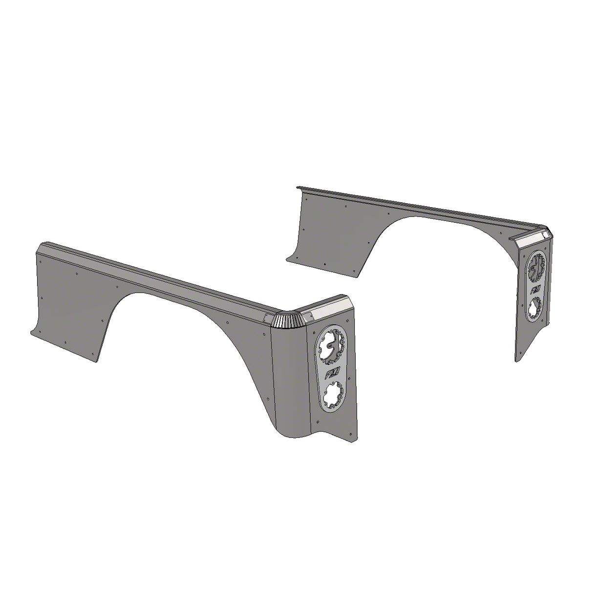 DESCRIPTIONOver the bed rail 15 inch stretch corners are a heavy duty option for those doing the LJ stretch on a Jeep YJ. We opted to go over the rail on the Motobilt YJ build for a few reasons. The first was a more complete finished look on the body stretch with the corners. We also wanted to add additional strength to the corner armor. The corners are manufactured from 3/16” light weight aluminum plate. By adding 2 bends to the top edge and closing in the rear curve around the body we added a lot more protection for the body making the corner armor stronger than traditional designs.Not only do the corners extend the body 15 inches we also moved the wheel opening up as high as possible to allow for lower bump heights and/or ride heights. By doing so we needed the added material on the rear corner armor to ensure it would still have structure with that much material cut out. The rear corner area features a tapered cut for added clearance and styling. The rear tail lights are one of the features most asked about. The aluminum bezels are on the outside of the corner armor with the taillights recessed into the body for added protection. The corner armor includes one pair of our pop in style LED tail lights and you also have the option to purchase a set of Off-Road Only Lite-Dots if you prefer those. The taillight mounts come complete with provisions to mount either style taillight you prefer. The wheel opening location provides approx a 16 inch wheelbase stretch from the stock YJ. The wheel opening also has been enlarged for large diameter tires. Keep in mind because the wheel opening has been moved as high as possible the stock height rear inner fender sheet metal will not work with the corners. We recommend using our YJ 15” Stretch High Line Rear Inner Fenders (MB5529) which can be purchased separately.Keep in mind your rocker guards will also have to be extended to match the new wheel opening. We offer two different options for 15” stretch rocker guards. For those looking for ultimate clearance you should check out the Motobilt boat side option. (MB1171) Don’t worry we offer a bolt on style as well. (MB1177 NO step) With either of the rocker guard options we include a plate with the corner armor to allow the installer to bolt the stretch corners to the stretch rocker guards. (MB1177-S With step)Each corner armor panel features countersunk holes for fasteners for a completely flush panel. We include all fasteners & rivnuts for installation.The 15" stretch over-the-rail corner armor for the YJ is also offered in steel, for those who plan to bash hard into things often. Aluminum is lighter in weight, but is easier to scratch during manufacturing, installation and on the trail when you hit rocks and trees. Let us know if you have any questions and sales team will be happy to assist. Notes: Will not work with factory tail gate hinges. You will need to convert your tailgate to vertical hinges or the Motobilt Fold Down Aluminum Tailgate PN MB1168The over the rail design does not allow for fitment of a soft top or hardtop The parts are shipped bare aluminum and do not require paint or powder coating unless you desire.
