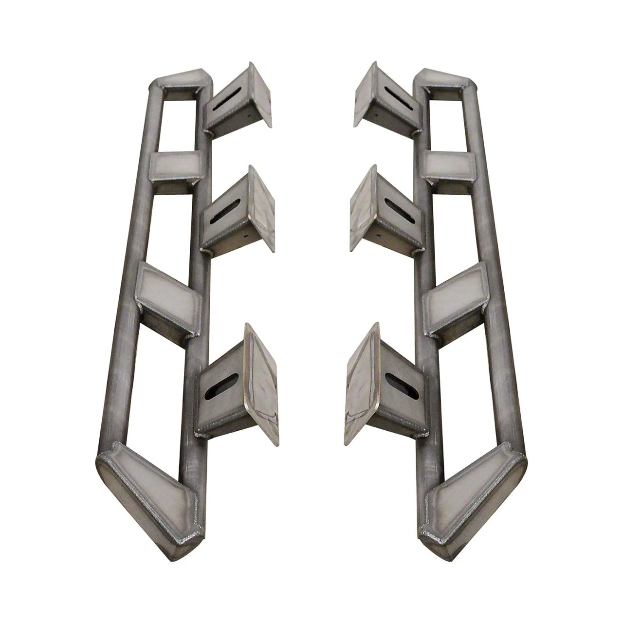 The tube slider portion of the JLU frame mounted rocker guards is 2” DOM steel tubing. The end caps and and center bracing are fabricated like the frame mounts from heavy duty 3/16” thick laser cut and formed steel plate. The rockers are shipped completely welded. They are shipped bare steel. Installing them will require welding and painting. If you opt to powder coat them test fit and know where you are going to put them to reduce chances of scratching them. Once powder coated you will need to grind the powder off of the edges that weld to the frame. After welding simply paint this area. We do not offer powder coating.