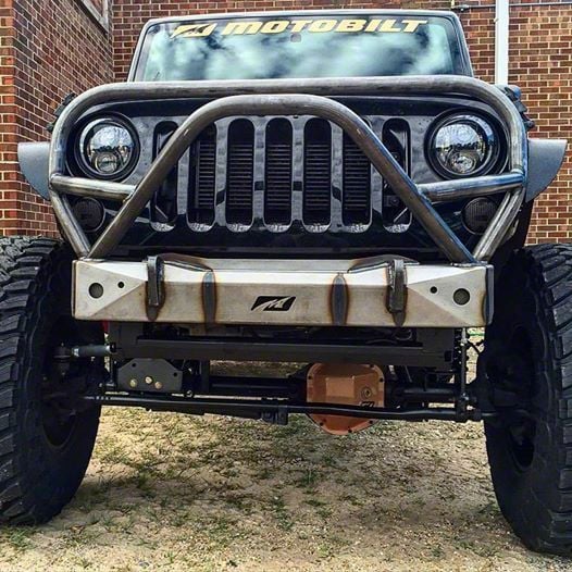 Enhances Your Jeep’s Front End Defense. Adding This Motobilt Stubby Front Bumper with Grille Hoop and Stinger in Bare Steel will give your Jeep greater protection against the dangers of the rugged trail. This front bumper is equipped with a grille hoop and stinger that help block and push road debris, wayward animals, and other hazards away from your vehicle. You can also equip This bumper with a WARN ZEON winch but you need to source a 3/16-inch steel spacer.