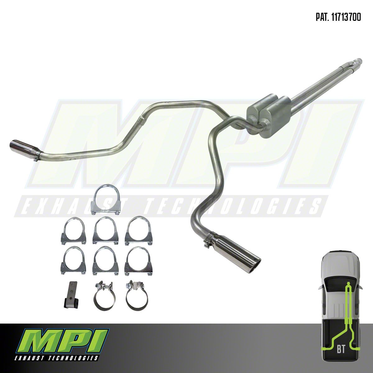 High-Performance Exhaust System. The MPI Exhaust Technologies Performance Series Clamp-On Dual Exhaust System with Chrome Tips offers a significant upgrade in both performance and sound for your vehicle. This dual cat-back system provides dyno-proven gains of 16 horsepower and 20 pound-foot of torque while delivering an aggressive exhaust note without any in-cabin droning. Ideal for enthusiasts looking to enhance both the power and acoustic quality of their vehicle.
