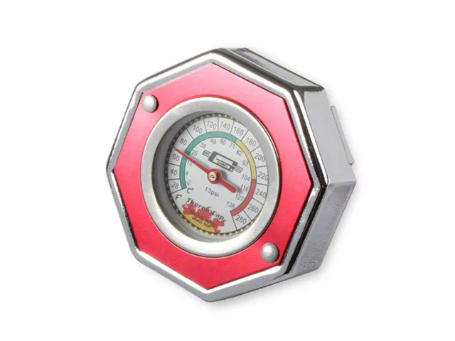 Octagon Cap. Plus, its octagon shape and red anodized finish add a unique and stylish touch to your radiator. The cap's 30-270 degrees Fahrenheit gauge range caters to a broad spectrum of operating conditions, ensuring accurate readings at all times. This Thermocap Radiator Cap is not just a functional enhancement but also a safety device, designed to be user-friendly.