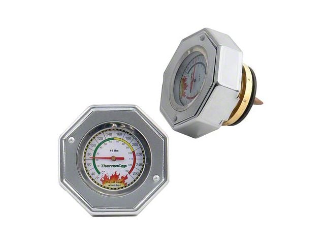 Description. Knowing your coolant temperature can help to prevent burn injuries. Thermo Cap, with its built-in calibrated thermometer, indicates the coolant temperature. This is useful information prior to cap removal. Never attempt to remove Thermo Cap when the coolant temperature is very hot. The escaping hot coolant and steam may burn you. Check the Thermo Cap temperature indicator to determine if the coolant is cool enough to make removing Thermo Cap safe. If the coolant is very hot, then thoroughly rinse the radiator with cool water, until the coolant temperature drops into a cooler safe zone Thermo Cap's integrated coolant reclamation valve works great with your coolant recovery system. Your radiator can reclaim coolant from your overflow bottle. Wide 30 degree to 270 degree Fahrenheit temperature range. Calibrated in centigrade and Fahrenheit. Color-coded temperature ranges. Chromed crown with a colored trim ring. Indicates coolant temperature, Helps to prevent coolant injuries, integrated coolant reclamation valve, Improves under hood appearance, Fits most domestic or import vehicles and various valve pressures available.