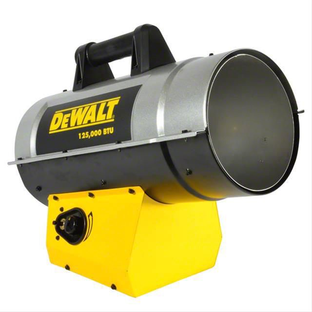 Description. DeWALT 125,000 BTU/HR Forced Air Propane Heater. Forced air propane heater with 125K BTU heat output and variable heat output of 85K to 125K BTU and will run 7 hours on high setting using a 40 Lb. propane tank.