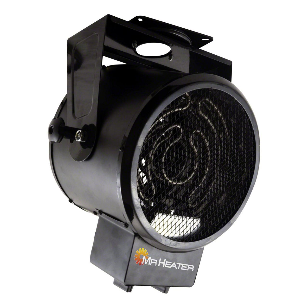 Description. Mr Heater's ceiling mounted electric heater is a perfect solution for any garage, barn or workshop. No ventilation is required so installation is a breeze. You just need a 240v power supply from a 30amp circuit. The laminated enclosed industrial strength motor and heavy duty electric coils will provide years of trouble free heat.