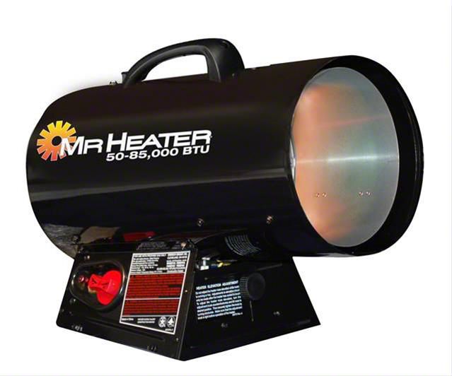Description. Heavy-duty design built for the jobsite. The Mr. Heater Liquid Propane Forced Air Heater comes with a standard 10ft hose and regulator and all the safety you would expect of a Mr. Heater product. Equipped with factory installed high limit switches and thermoelectric safety valves, you can feel comfortable using these heaters on any jobsite. Just plug the heater into a 110v outlet, hook up the included hose and regulator to a 20lb propane tank or larger, and you are ready to take the chill out of any job.