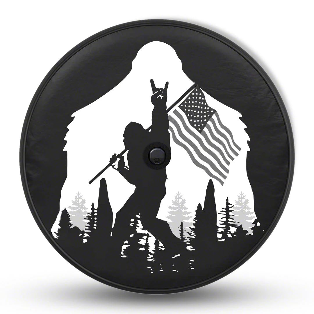Construction and Appearance. Crafted from premium-grade materials, this spare tire cover is both weatherproof and UV-resistant to ensure long-lasting durability. The matte black background is accented by a crisp white Sasquatch emblem, giving it a clean and modern look with a dash of rugged patriotism. It’s built to withstand harsh sun, wind, and rain while preserving its finish over time.