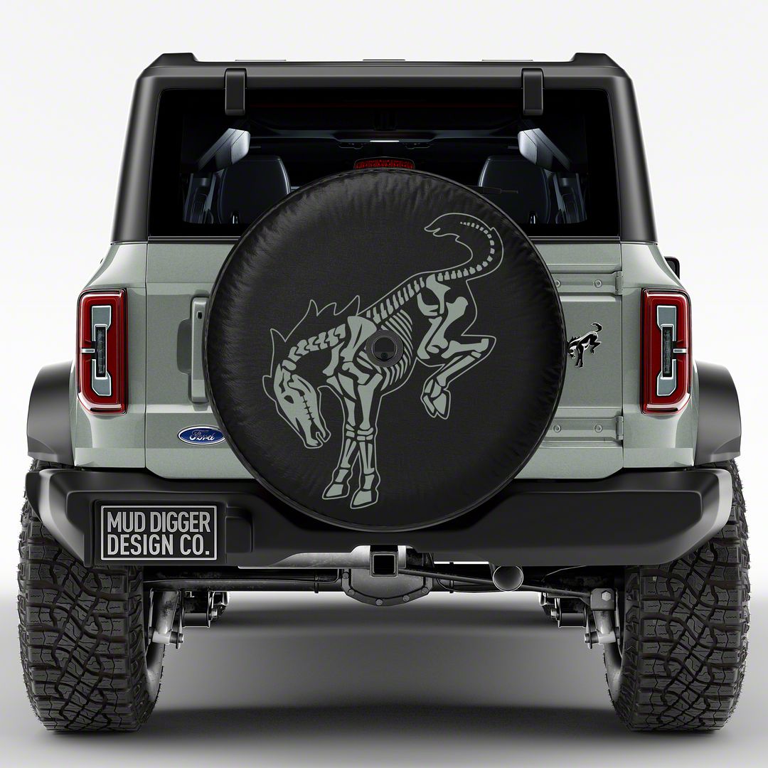 Application. This Mud Digger Designs Spare Tire Cover With Cactus Grey Skeleton Bronco Logo; Black fits 2021–2026 Bronco models equipped with 315/70R17 spare tires.