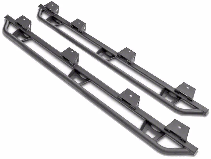 Powder-Coated Steel. Crafted from robust 3/16-inch heavy gauge steel, these sliders promise superior undercarriage protection against the harshest of trails. Each slider is meticulously designed with full welds and added gussets, ensuring unparalleled strength and longevity. Finished with a textured black powder coat, they resist corrosion and wear, maintaining their sleek appearance through all your adventures.