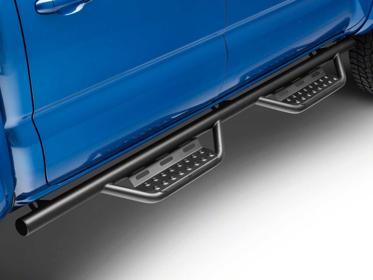 Low-Profile Access and Protection. Protect your Tacoma’s rocker panels while offering safe and easy cab access with the N-Fab Cab Length RS Nerf Side Step Bars; Textured Black. These nerf-style side step bars offer excellent rocker panel protection thanks to a combination of a brawny all-steel build and a mounting position that’s close to your truck’s body. This design also adds a sleek styling cue to your truck that’s sure to turn heads wherever you drive. Best of all, these step bars feature drop-down steps equipped with heavy-traction step plates, ensuring you and your passengers have a secure foothold for safe cab access.