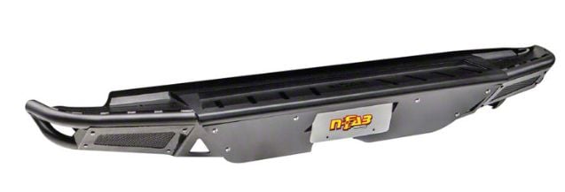Tough Off-Road Guard. N-Fab offers a superior rear bumper upgrade that significantly improves your Toyota Tundra’s rear end style and off-road protection. This RBS-H Textured Black Rear Bumper comes with a skid plate and maintains a sleek and compact fit for better clearance and departure angle. It also conveniently provides a license plate mount and retains your factory hitch.