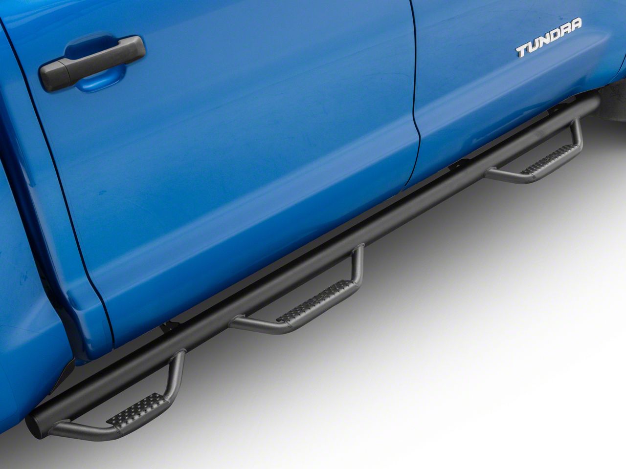 Easy Truck Access and Effective Protection. Provide your Toyota Tundra with an easy access solution that also protects your rocker panels from damage with the N-Fab Wheel 2 Wheel Textured Black Bed Access Nerf Side Step Bars. These side step bars feature 3 built-in dropped side steps that each come with a high-traction knurled step plate. This design offers you and your passengers with easy access into your truck, all the way up to your truck bed. What's more, these nerf bars are built tough and mount close to your cab body, providing effective protection against debris, rock shards, and pebbles.
