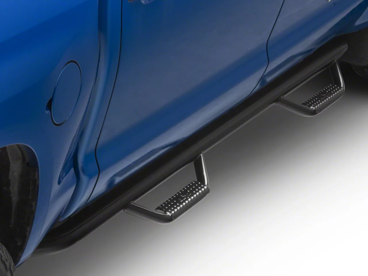 Dual Function Side Step Bars. The gloss black N-Fab Wheel 2 Wheel Gloss Black Nerf Side Step Bars is the truck access solution for your Toyota Tundra that also doubles as effective rocker panel protection. These nerf bars feature integrated dropped side steps, offering you and your passengers with a safe and easy way to enter and exit your truck. The steps themselves feature heavy-traction metal step plates, ensuring a secure foothold for you and your passengers. What's more, these nerf step bars’ rugged build quality, and close-fitting mounting position works as a barrier between road debris and your rocker panels.