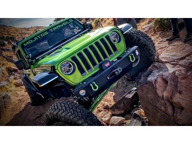 Description. Mid-width front bumper for Jeep JL Wrangler and Jeep JT Gladiator with factory fog light mounts, featuring heavy-duty steel construction, aggressive approach angles, built-in recovery points, and factory fog light provisions.