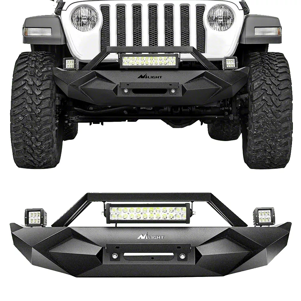 Rugged Utility and Style. The Nilight Stubby Winch Mount Front Bumper with LED Lights is designed to provide both utility and style to your Jeep Gladiator. Featuring a robust winch plate with up to 12,000 pounds winch capacity, this bumper enhances your vehicle's off-road capabilities while ensuring it looks tough and ready for adventure.