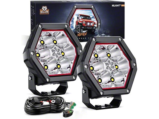 Illuminate Your Journey. Light up the way with the Nilight 4-Inch Hexagon LED Pod Lights, a pair of uniquely designed, hexagon-shaped spot beam lights. Engineered for versatility, these pod lights feature dual light modes, including a powerful main light for clear visibility and a red DRL for enhanced safety and style. The spot beam pattern ensures focused illumination, perfect for navigating through dark terrains.