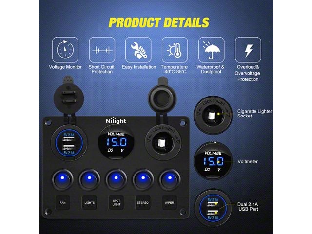 Control and Safety. Introducing the Nilight 5-Gang Multi-Function Rocker Switch Panel in Blue LED – the ultimate control center for your 12V-24V electrical systems. This sleek and durable panel features 5 easy-to-use On/Off rocker switches with captivating blue LED lights, making it a stylish addition to your vehicle or boat. Safety is a top priority with this switch panel. It also comes equipped with voltage monitoring to ensure your system's safety, along with short circuit, overload, and overvoltage protection.