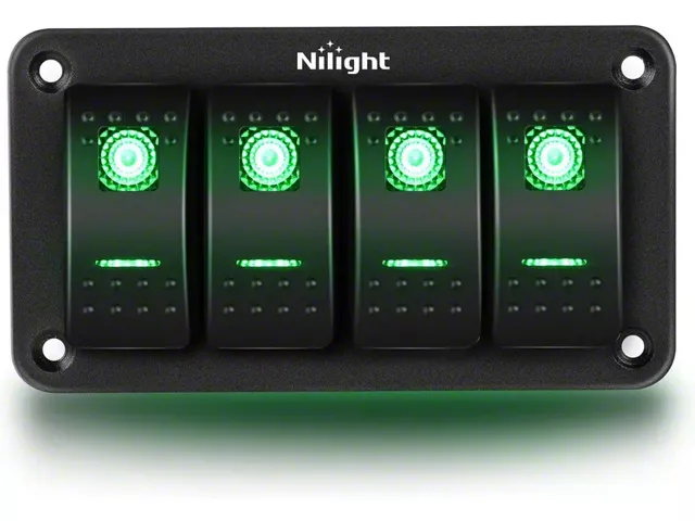Streamline Your Electrical Accessories with a Compact Switch Panel. This 4-Gang Aluminum Rocker Switch Panel gives you centralized control of up to four auxiliary devices, such as light bars, winches, air systems, or other add-ons. The green LED-backlit switches make it easy to identify circuits in low light, while the compact layout keeps your dashboard neat and accessible.
