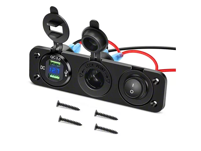 Comprehensive Connectivity. The Nilight 4-in-1 Charger Socket Panel is a versatile accessory designed to enhance the functionality of your vehicle's dashboard. It features dual QC3.0 USB chargers for fast charging, an LED voltmeter display for monitoring battery health, a cigarette lighter socket, and a power cutoff switch for added safety and control.