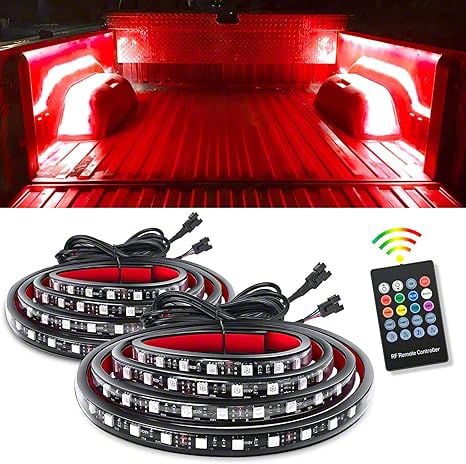 Designed for more lighting options for truck bed light strip. Not just for white light for lighting up, but more options for fun. Include 8 solid colors, 4 music modes, colors jumping/fading, and brightness/speed adjustable options. Super bright and charming light, stable RF remote control, and quality IP67 sealed light strip, durable and flexible. Also comes with straight forward use extension wires for convenient use.