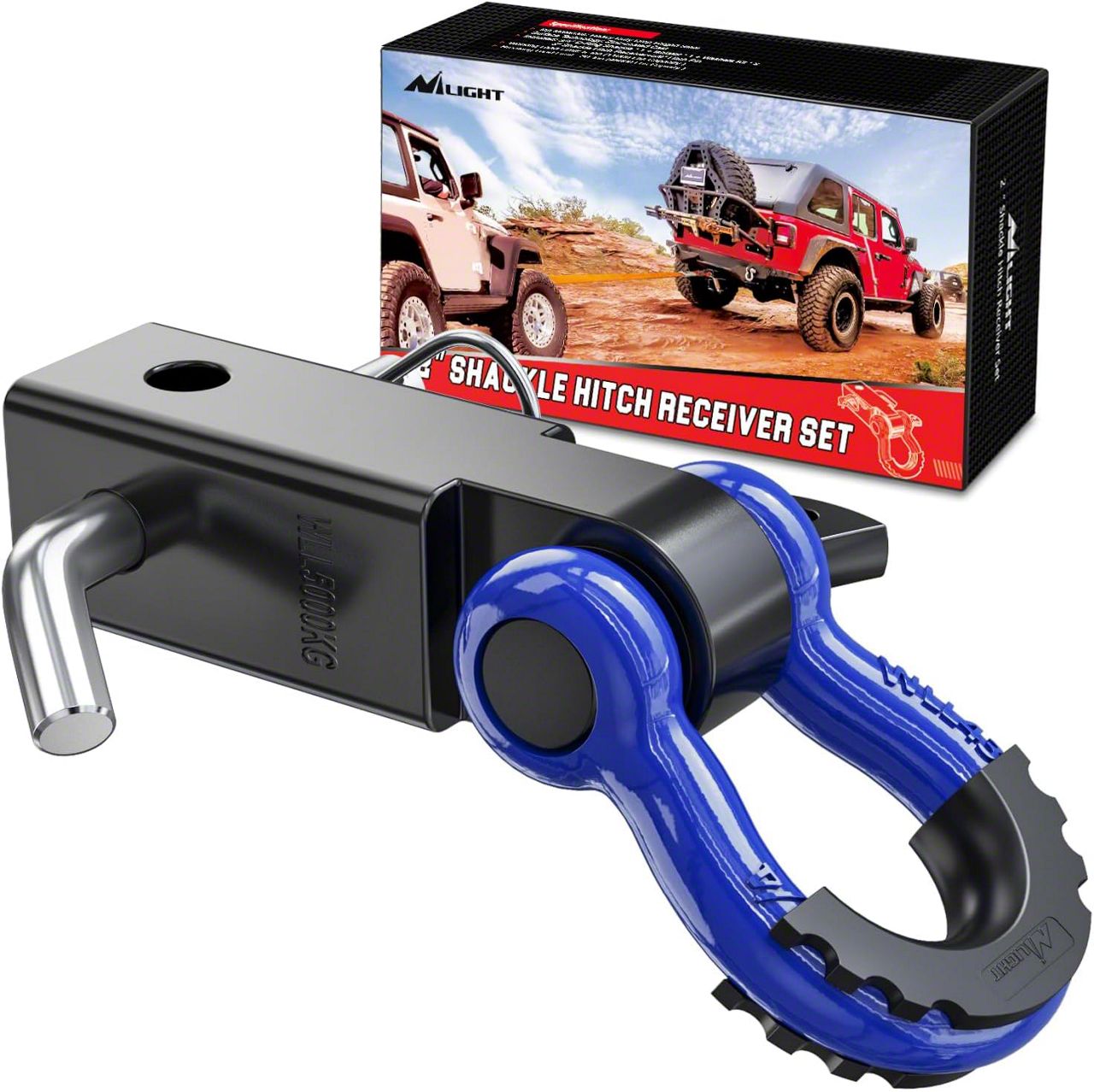 Better Visibility. The bright blue finish of the Nilight 2-Inch Hitch Receiver's 3/4-Inch D-Ring Shackle not only adds a stylish and eye-catching touch to your vehicle but also serves a practical purpose by improving visibility. The vibrant blue color enhances the aesthetics of the shackle, giving it a distinctive and modern look. Additionally, the bright blue finish increases visibility, making it easier to locate the shackle, even in poor lighting conditions or low visibility environments. This improved visibility is crucial during towing or recovery operations, as it allows for quick and efficient attachment and detachment of equipment.