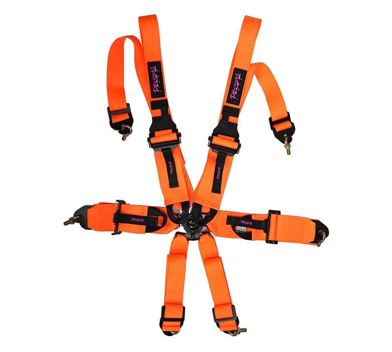 NRG Innovations FIA HANS Approved 6-Point Rotary Cam-Lock Racing Seat Belt Harness; Neon Orange with Prisma Logo