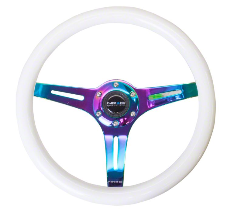 Striking Steering Style. The NRG Innovations Classic Wood Grain 350mm Steering Wheel is a standout upgrade for any driver looking to enhance both the form and function of their vehicle’s interior. With its vibrant neochrome finish and captivating blue glow-in-the-dark accents, this wheel brings a custom flair that stands out in any lighting condition. Engineered for a superior driving feel, it offers precise control and a comfortable grip for everyday and spirited driving.