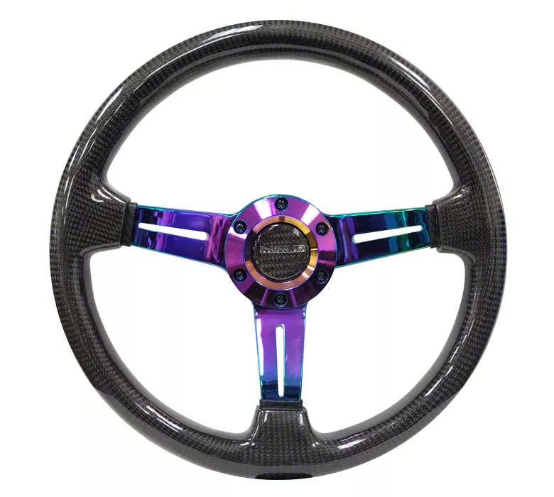 Construction and Appearance. Crafted entirely from premium carbon fiber, this steering wheel is lightweight yet extremely durable. The eye-catching neo chrome spokes contrast beautifully with the full carbon rim, adding a futuristic look. Its 1.50-inch deep dish layout provides an aggressive stance and enhanced steering leverage.