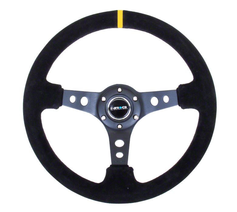 Construction and Appearance. Crafted with a durable matte black suede finish, this steering wheel ensures a comfortable grip while reducing hand fatigue during long drives. The hazard yellow center mark adds a bold racing-inspired touch, making it both functional and visually appealing. Precision-drilled holes further enhance its lightweight design.