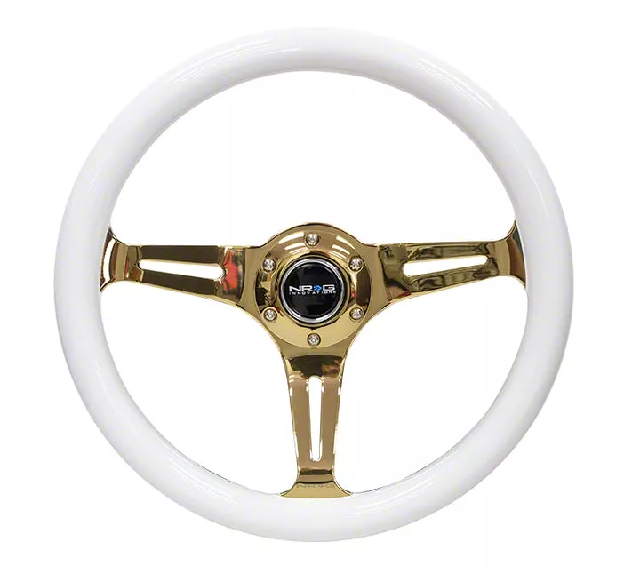 Timeless Style With Modern Build Quality. The NRG Innovations Classic Wood Grain Steering Wheel delivers a retro-inspired look with modern materials and fitment. With gold aluminum spokes and a white grip, it adds bold character to any custom build, while offering precise steering control for spirited driving.