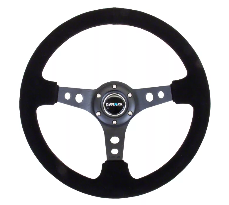 Construction and Appearance. Crafted with a matte black suede finish, this steering wheel offers a premium feel while improving grip and reducing slippage during high-performance driving. The strategically placed holes add a lightweight yet aggressive look, making it a standout addition to any interior.