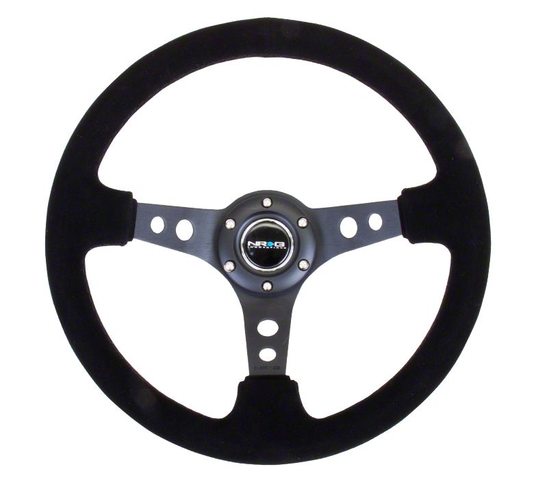 Construction and Appearance. Crafted with a matte black suede finish, this steering wheel offers a premium feel while improving grip and reducing slippage during high-performance driving. The strategically placed holes add a lightweight yet aggressive look, making it a standout addition to any interior.