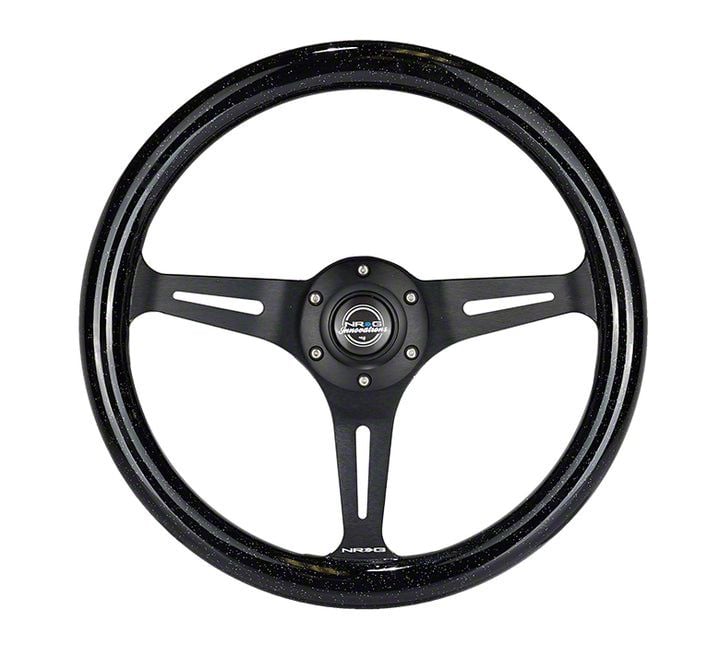Construction and Appearance. This steering wheel features a high-quality wood grain finish that exudes a timeless appeal, paired with a durable, lightweight aluminum frame for enhanced strength and longevity. The polished Black and Sparkle Black design creates a sleek contrast, ensuring a bold yet sophisticated appearance inside your vehicle.