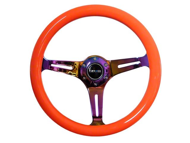 Striking Neochrome Centerpiece. The NRG Innovations Classic Wood Grain 350mm Steering Wheel immediately captures attention with its vibrant neochrome center. This modern and eye-catching finish provides a stunning visual contrast to the timeless appeal of the classic wood grain rim and the subtle yet distinctive neon orange accents. The neochrome center not only adds a contemporary flair to the steering wheel but also serves as a focal point, enhancing the overall aesthetic appeal of the vehicle's interior.