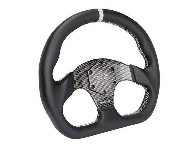 Construction and Appearance. Built from premium leather and lightweight carbon fiber materials, this wheel is both durable and visually striking. The silver carbon fiber finish adds a modern, high-performance touch, while the ergonomic flat bottom design improves leg clearance and hand placement. Enhanced grip zones provide a tactile feel that translates into better control behind the wheel.