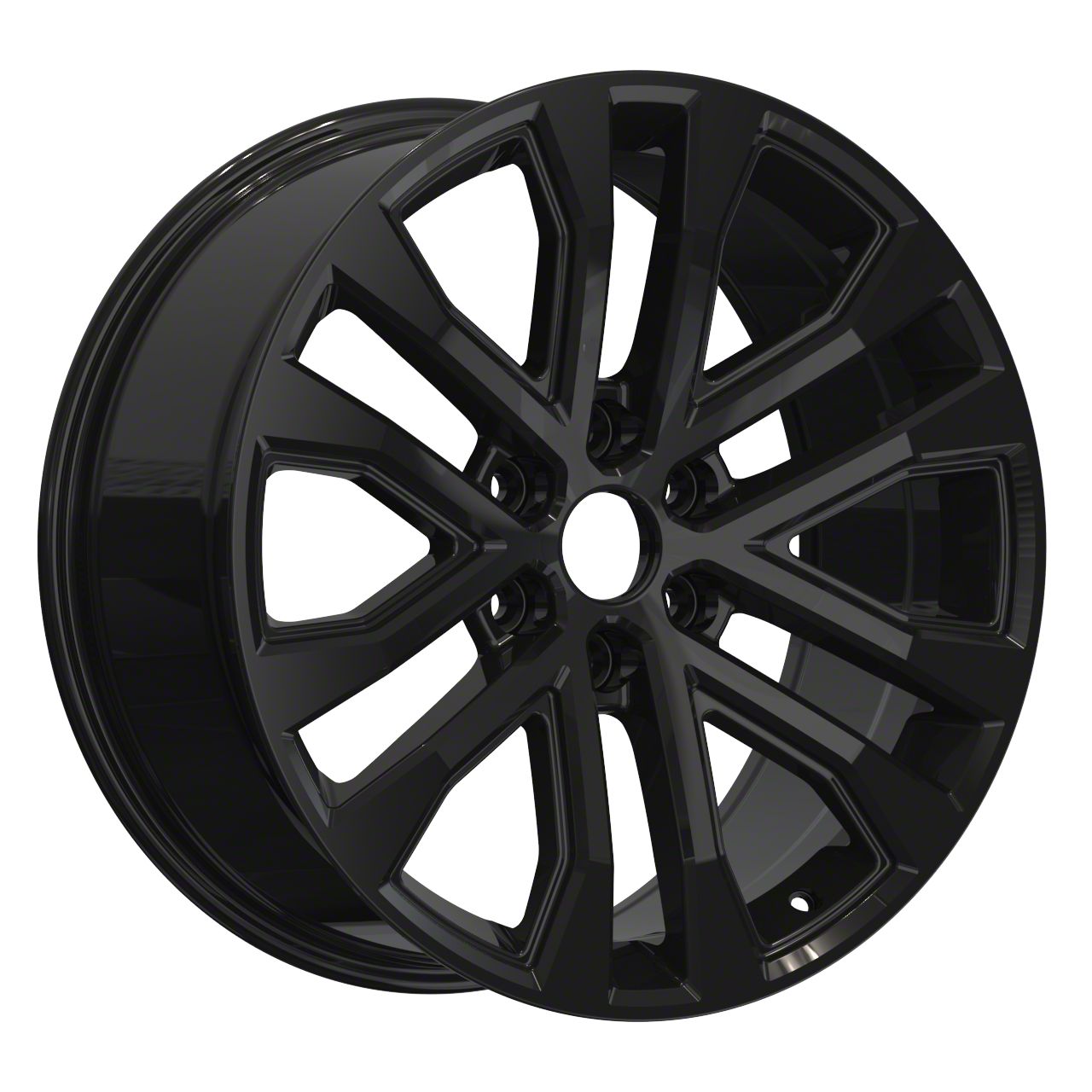 The 22x9.5 OE Concept F-150 XLT Replica Gloss Black Machined 6-Lug Wheel; 22x9.5; 44mm Offset is completed in a gloss black finish with machined accents that will make everyone green with envy. This wheel features a durable clear coat that is tough enough to stand up against the hazards of everyday driving.