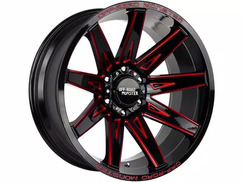 Off-Road Monster M25 Gloss Black Candy Red Milled 6-Lug Wheel; 20x10; -2019mm Offset - Enhance your vehicle's style with the Off-Road Monster wheel. This wheel's distinctive design and finish complement your vehicle's aesthetics, making a bold statement. It's crafted to accentuate the unique character of your car, emphasizing a premium and robust appeal.