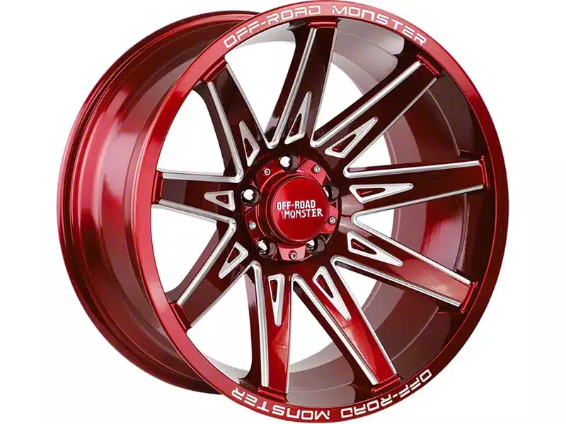 Off-Road Monster M25 Candy Red Milled 6-Lug Wheel; 20x10; -19mm Offset. The Off-Road Monster M25 Candy Red Milled 6-Lug Wheel; 20x10; -19mm Offset features a sleek and modern design that enhances the overall aesthetic of any vehicle. Its brushed gunmetal finish adds a touch of sophistication and complements various vehicle styles. This wheel's premium construction ensures durability and a robust appearance.