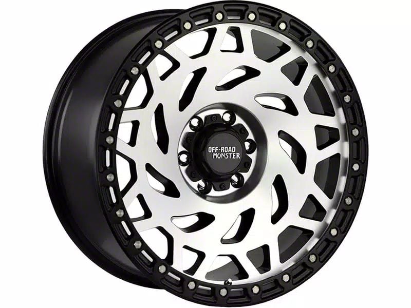 Off-Road Monster M50 Gloss Black Machined with Black Ring 6-Lug Wheel; 17x9; 0mm Offset exudes sophistication with its finish, offering a sleek and modern appeal to any vehicle it adorns. The design is meticulously crafted to enhance the aesthetic of your vehicle, giving it a distinctive and upscale look. Perfect for those seeking to elevate their vehicle's style, this wheel blends seamlessly with both contemporary and classic vehicle designs, making it a versatile choice for a wide range of vehicles. Its robust construction ensures durability, making it a reliable choice for drivers who value both style and quality.