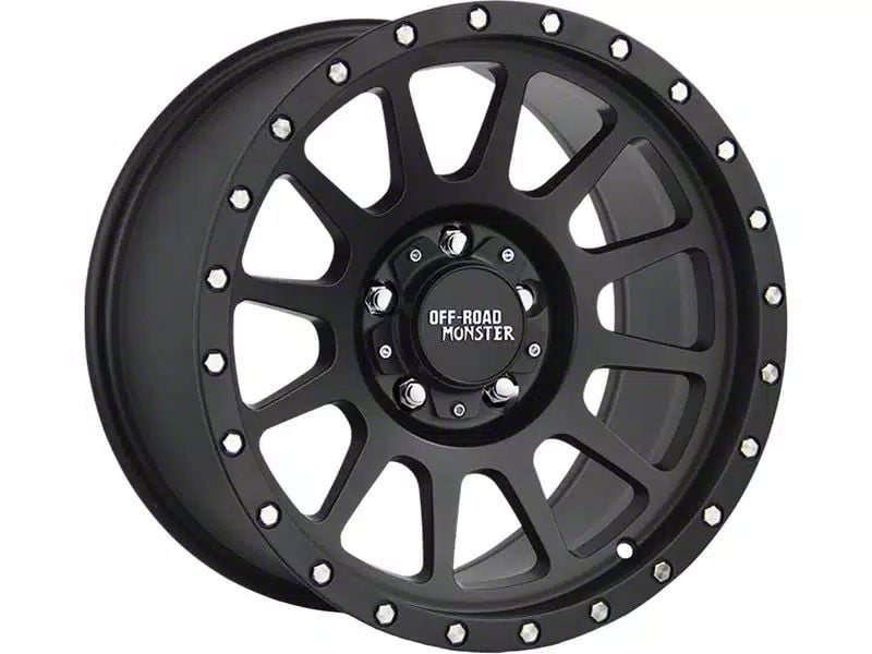 Off-Road Monster M10 Flat Black Wheel; 17x9 presents a striking balance of style and sophistication. The design of this wheel accentuates the vehicle's appearance, complementing its distinctive character. Its construction reflects the premium quality expected from Off-Road Monster.