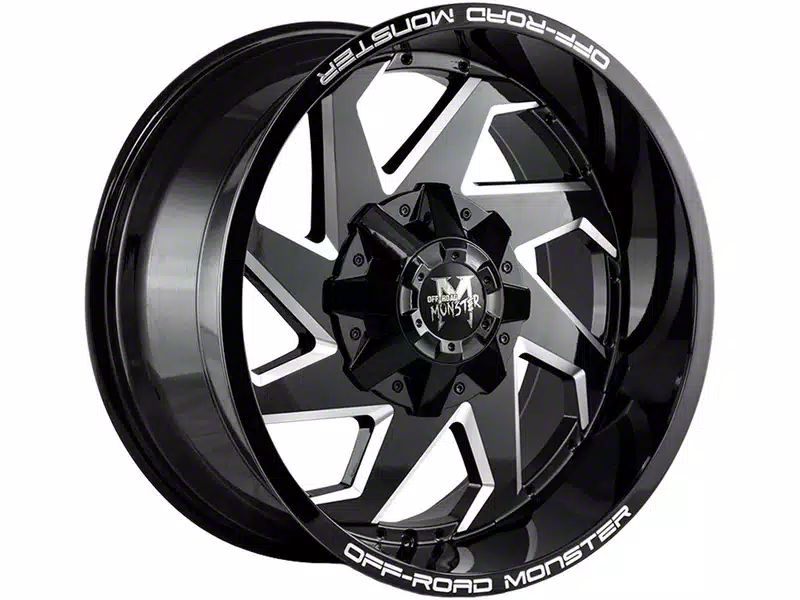 This 20x10 Off-Road Monster M09 Gloss Black Milled Wheel is completed in a high-quality gloss black finish with steel milled accents that will make the wheel the envy of everyone. There is a durable clear coat that protects against driving hazards.One-Piece Cast Aluminum Construction. This wheel is manufactured using gravity casting. Gravity casting is the process of pouring a molten aluminum alloy into a wheel mold or form utilizing the earth's own gravity to help fill the mold. The result is a strong, durable wheel that has the same good looks as a more expensive wheel, at a fraction of the price.