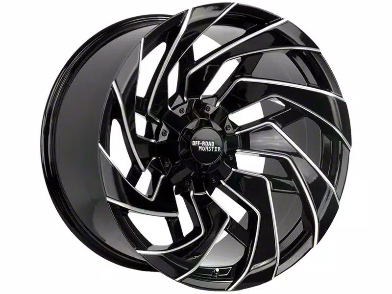 Off-Road Monster M24 Gloss Black Milled Wheel; 20x10; -19mm Offset - This wheel's elegant design will certainly enhance your vehicle's aesthetic, complementing its luxury and performance. The unique styling of this wheel makes it an ideal choice for a standout quality of your ride, reflecting the premium quality associated with the Off-Road Monster brand.