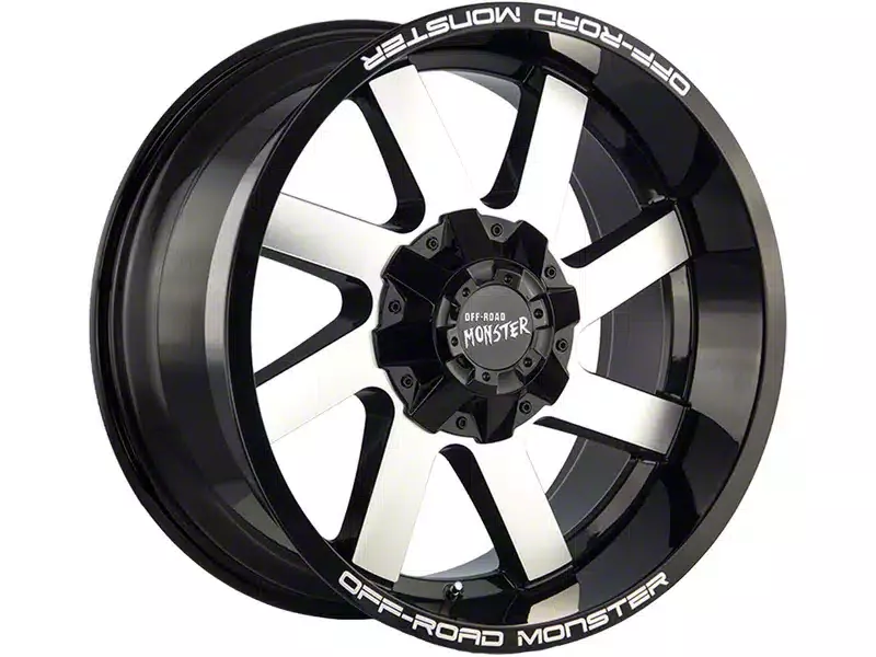 Off-Road Monster M80 Gloss Black Machined Wheel; 20x12; -44mm Offset offers a striking balance between style and durability. The design speaks to the brand's commitment to quality, enhancing the vehicle's appearance with its distinct look. This wheel, with its unique aesthetics, is ideal for drivers who appreciate a blend of modern design and robust functionality.